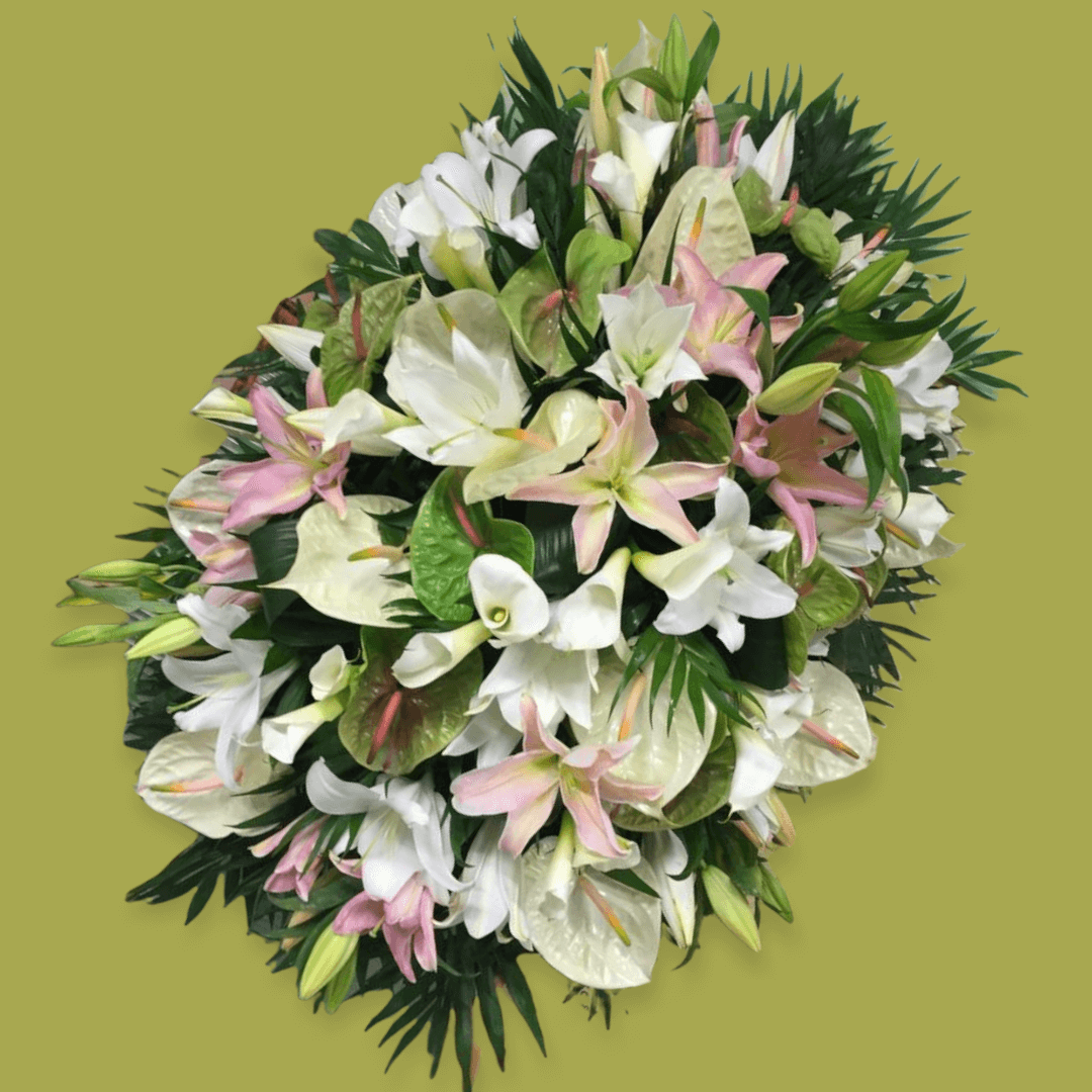 Composizione funebre di fiori freschi. Il cofano è un copribara che viene posizionato sul feretro, e lo ricopre in tutta la sua lunghezza. Per questa composizione utilizziamo fiori freschi misti secondo stagionalità e disponibilità.