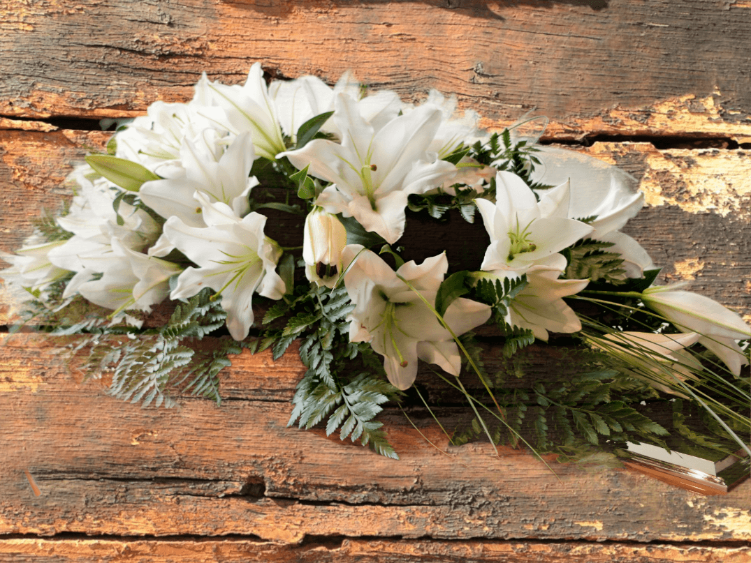 Composizione funebre di fiori freschi. Il cuscino funebre è un copribara di forma tondeggiante che viene posizionato in testa al feretro. Per questa composizione utilizziamo fiori freschi della tipologia Lilium bianchi.