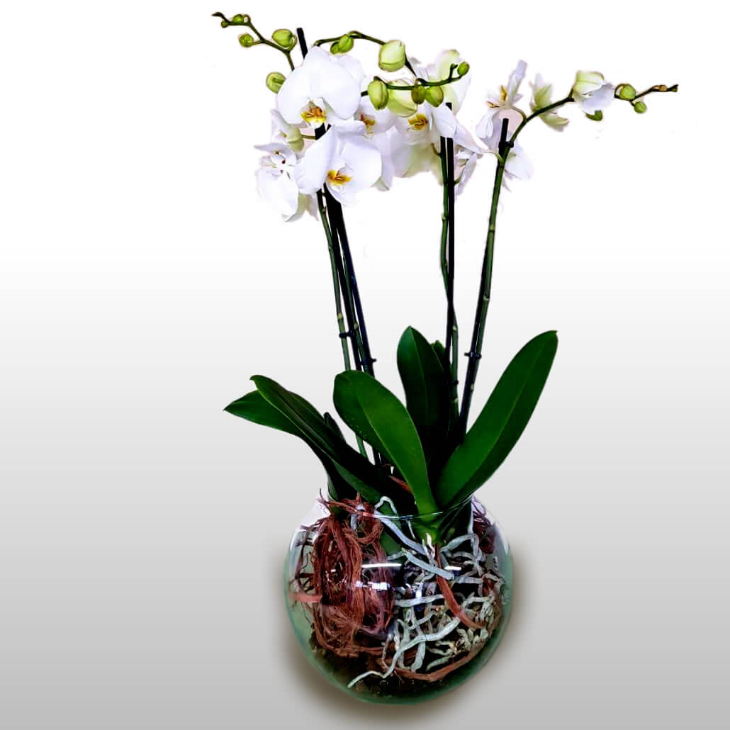 Genova – Composizione di 2 piante di Orchidea bianca (4 steli) in una boccia di vetro trasparente, decorata con fili di corteccia a vista.