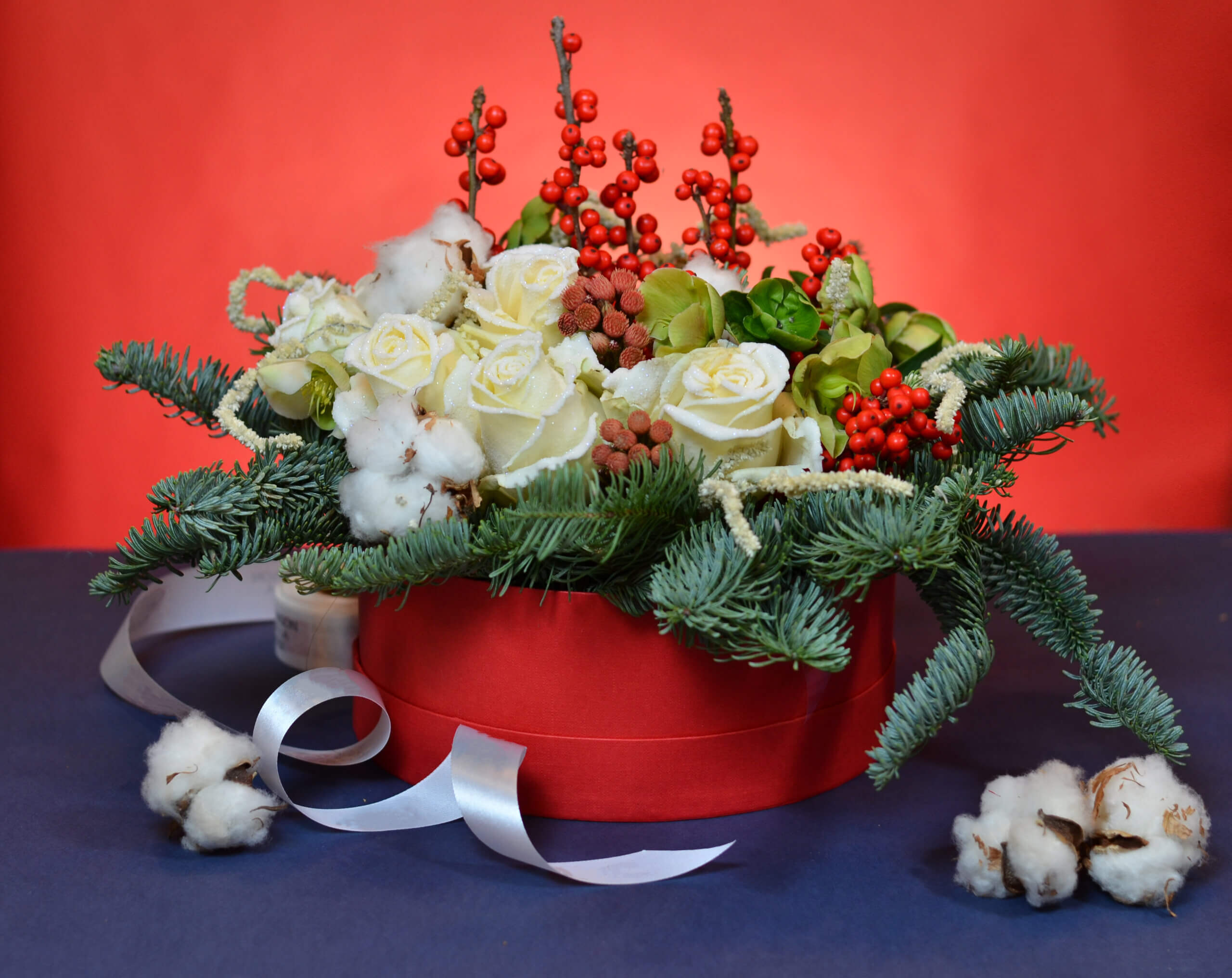 Natale in montagna – Christmas Flower Box in cappelliera con rose bianche, rami d’abete, rose di Natale, fiori di cotone e bacche rosse.